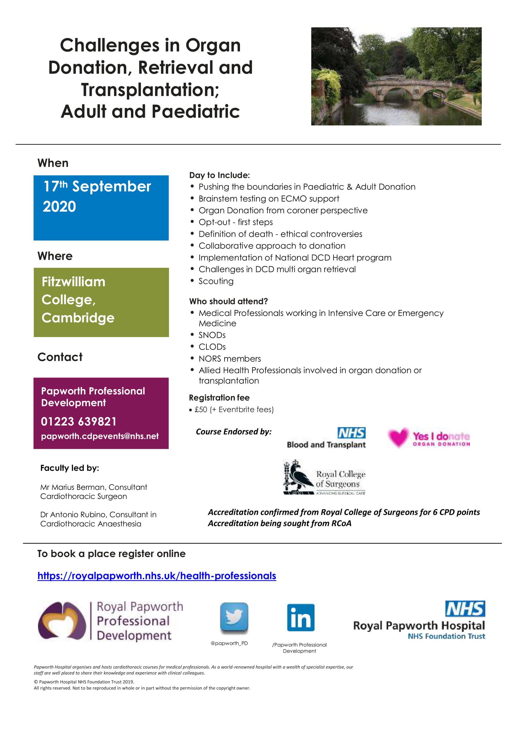 Organ Donation and Transplantation Study Day is a study day hosted by Royal Papworth Professional Development welcoming many speakers who cover topics on Paediatric, Adult and Mechanical support withdrawal.